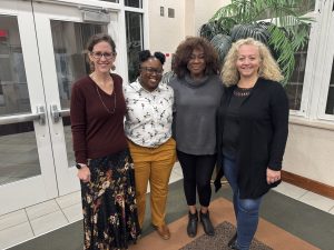 Jessica Elisheva Emerson visits Earlham College in October 2025. Pictured L-R are Jessica with her hosts Dez Brown, Onyinye Ihezukwu, and Rebecca Wartell